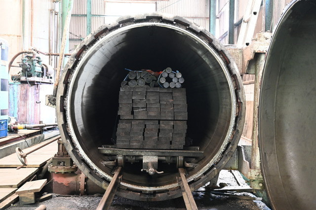 近年木材の利用が多くなってきた中で、木の特性として水気による腐敗が課題として挙げられます。そこで、ご注文、持ち込まれた木材を真空釜で特殊な薬剤を注入します。